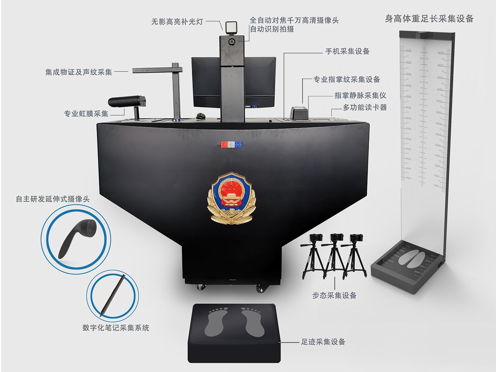 本采集平台集成度高,全方位整合了各类信息采集设备,采集信息全面、标准。所有功能模块均按工业级标准设计, 并且采用模块化整合,具有全面、便捷、实用、安全、高效、兼容等特点,是理想的一体化信息采集平台。平台针对监所部门罪犯人员及公安部门涉案嫌疑人自身信息全方位采集设计。其中包含对被采集人员的基本信息采集、人像信息采集、身高体重足长信息采集、体表特征信息采集、指掌纹信息采集、声纹信息采集、数字笔迹信息采集、足迹信息采集、体貌特征信息采集、虹膜信息采集、物品信息采集、文本文档信息采集、血常规信息采集、毒品检测、手机采集、证件照打印等功能模块。
