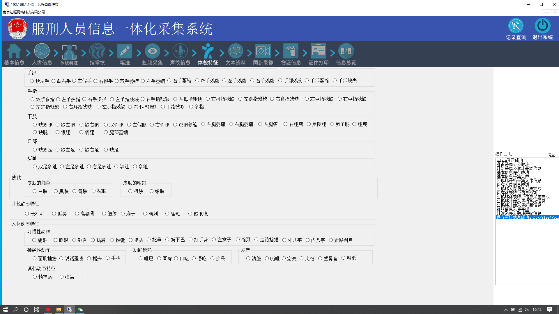 本采集平台集成度高,全方位整合了各类信息采集设备,采集信息全面、标准。所有功能模块均按工业级标准设计, 并且采用模块化整合,具有全面、便捷、实用、安全、高效、兼容等特点,是理想的一体化信息采集平台。平台针对监所部门罪犯人员及公安部门涉案嫌疑人自身信息全方位采集设计。其中包含对被采集人员的基本信息采集、人像信息采集、身高体重足长信息采集、体表特征信息采集、指掌纹信息采集、声纹信息采集、数字笔迹信息采集、足迹信息采集、体貌特征信息采集、虹膜信息采集、物品信息采集、文本文档信息采集、血常规信息采集、毒品检测、手机采集、证件照打印等功能模块。